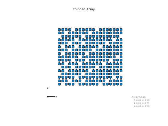 M = 19; % Number of elements on each row N = 17; % Number of elements on each column dy = 0.5; % Spacing between elements on each row (m) dz = 0.5; % Spacing between elements on each column (m) refArray = phased.URA([N M],[dz dy]); pos = getElementPosition(refArray); elemToRemove = [3:11:M*(N-1)/2 M*N-3:-11:(N+1)/2]; pos(:,elemToRemove) = []; thinnedURA = phased.ConformalArray('ElementPosition',pos,... 'ElementNormal',zeros(2,size(pos,2))); viewArray(thinnedURA,'Title','Thinned Array');