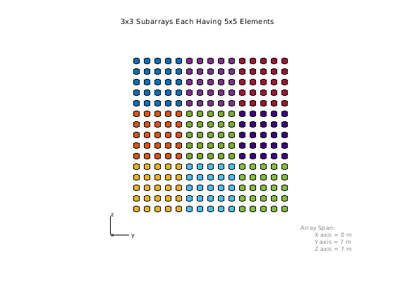 replicatedURA = phased.ReplicatedSubarray('Subarray',phased.URA(5),... 'Layout','Rectangular',... 'GridSize',[3 3],'GridSpacing','Auto'); viewArray(replicatedURA,'Title','3x3 Subarrays Each Having 5x5 Elements');