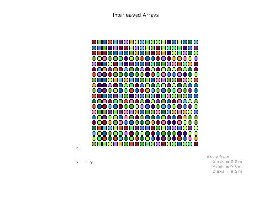 N = 20; idx = reshape(randperm(N*N),N,N); sel = zeros(N,N*N); for i =1:N, sel(i,idx(i,:)) = 1; end interleavedArray = phased.PartitionedArray('Array',phased.URA(N),... 'SubarraySelection',sel); viewArray(interleavedArray,'Title','Interleaved Arrays');