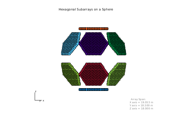 R = 9; % Radius (m) az = unigrid(-180,60,180,'[)'); % Azimuth angles el = unigrid(-30,60,30); % Elevation angles (excluding poles) [az_grid, el_grid] = meshgrid(az,el); poles = [0 0; -90 90]; % Add south and north poles nDir = [poles [az_grid(:) el_grid(:)]']; % Subarray normal directions N = size(nDir,2); % Number of subarrays [x, y, z] = sph2cart(degtorad(nDir(1,:)), degtorad(nDir(2,:)),R*ones(1,N)); sphericalHexagonalSubarray = phased.ReplicatedSubarray('Subarray',uha,... 'Layout','Custom',... 'SubarrayPosition',[x; y; z], ... 'SubarrayNormal',nDir); viewArray(sphericalHexagonalSubarray,... 'Title','Hexagonal Subarrays on a Sphere'); view(30,0)
