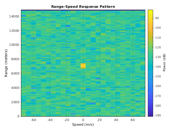 rangedoppler = phased.RangeDopplerResponse(... 'RangeMethod','Matched Filter',... 'PropagationSpeed',c,... 'DopplerOutput','Speed','OperatingFrequency',fc); plotResponse(rangedoppler,rx_puls,getMatchedFilter(waveform))