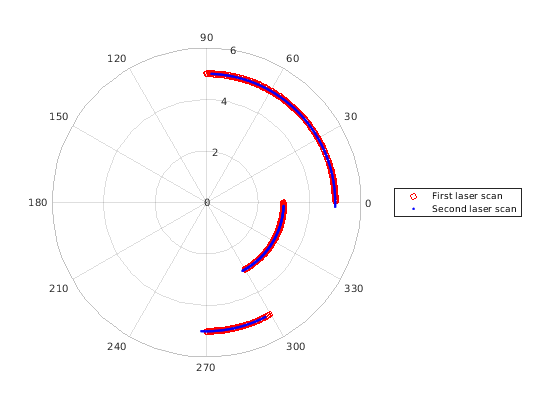 Задайте лазерное сканирование как области значений и углы. Создайте второе лазерное сканирование, которое смещается от первого использования transformScan. Это преобразование моделирует второе лазерное сканирование, собираемое из нового координатного кадра.