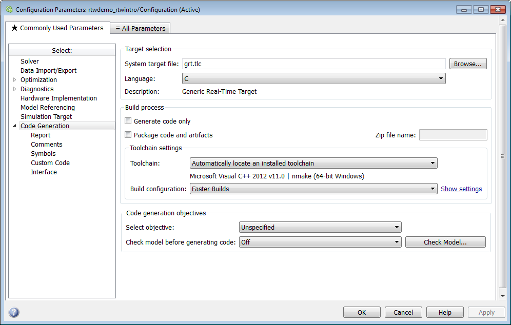 Опционально, в Советнике Генерации кода панель установила Избранное объективное поле на эффективность Выполнения или Отладку. Затем кликните по модели Check..., чтобы идентифицировать и систематически изменить параметры, чтобы достигнуть ваших целей.