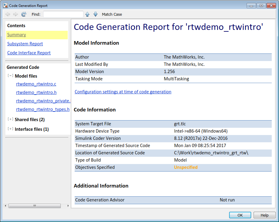 Отчет включает в себя ссылки на образцовые файлы, такие как rtwdemo_rtwintro.c и сопоставленные служебные и заголовочные файлы.