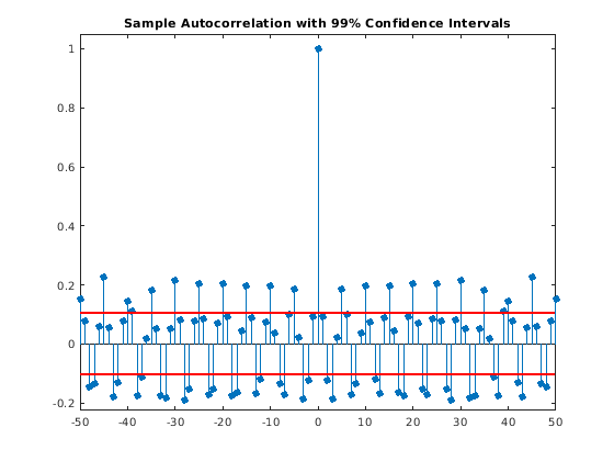 Создайте доверительные интервалы для последовательности автокорреляции белого шумового процесса.