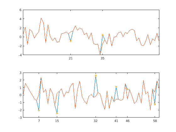 hampel(___) без выходных аргументов строит отфильтрованный сигнал и аннотирует выбросы, которые были удалены.