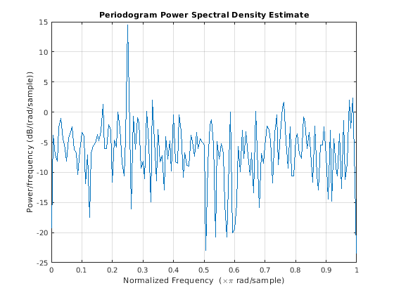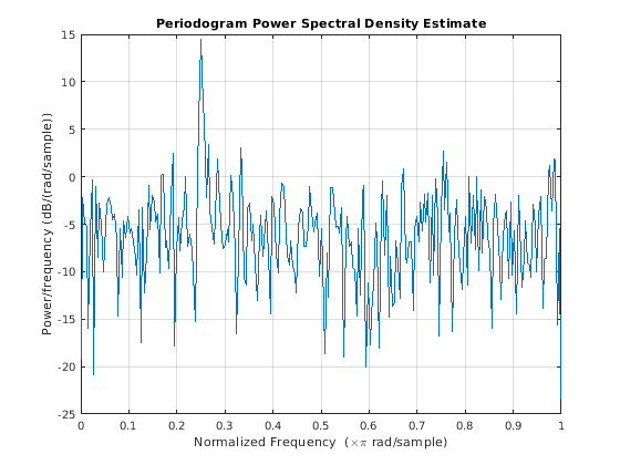 periodogram(___) без выходных аргументов строит периодограмму оценка PSD в дБ на модульную частоту в окне текущей фигуры.