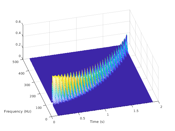 fs = 1e3; t = 0:1/fs:2; y = chirp(t,100,1,200,'quadratic'); [sp,fp,tp] = pspectrum(y,fs,'spectrogram'); mesh(tp,fp,sp) view(-15,60) xlabel('Time (s)') ylabel('Frequency (Hz)')