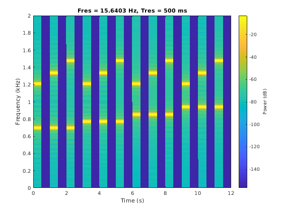 pspectrum(S,'spectrogram', ... 'TimeResolution',0.5,'OverlapPercent',0,'Leakage',0.85)