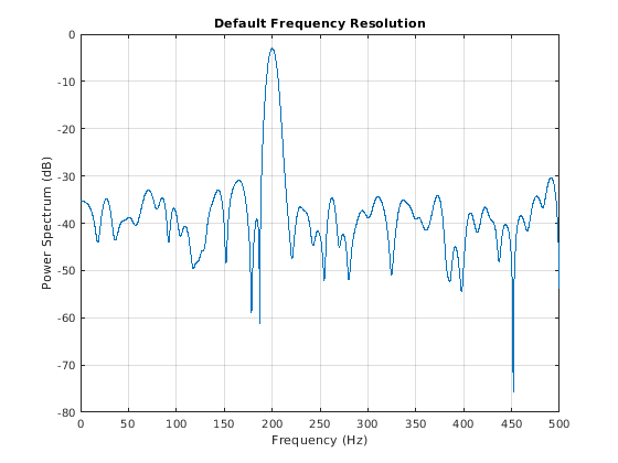 [pxx,f] = pspectrum(xTable); plot(f,pow2db(pxx)) grid on xlabel('Frequency (Hz)') ylabel('Power Spectrum (dB)') title('Default Frequency Resolution')