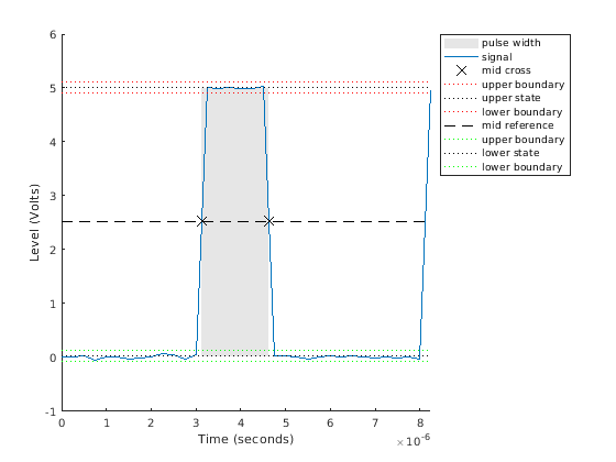 pulsewidth(...) строит сигнал и затемняет области каждого импульса, где ширина импульса вычисляется. Это отмечает местоположение середины пересечений и их связанного контрольного уровня. Государственные уровни и их связанные более низкие и верхние контуры (корректируемый парой Name,Value с именем 'Tolerance') также построены.