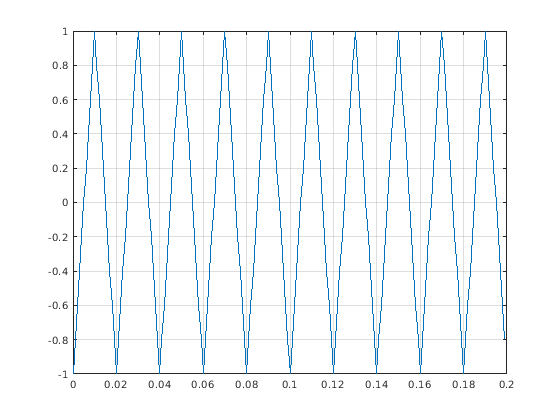 x = sawtooth(t)x = sawtooth(t,xmax) генерирует пилообразную волну с периодом 2π для элементов массива времени x = sawtooth(t)t. sawtooth подобен синусоидальной функции, но создает пилообразную волну с peaks –1 и 1. Пилообразная волна задана, чтобы быть –1 во множителях 2π и увеличиться линейно со временем с наклоном 1/π во все другие времена.