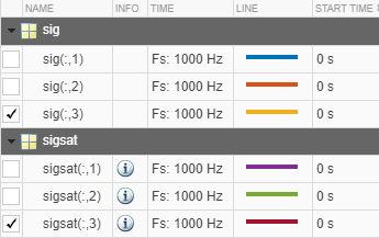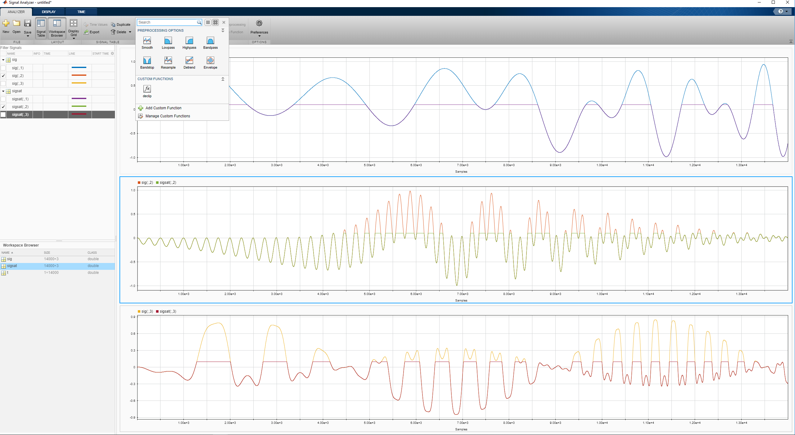 signalAnalyzer(sig1,...,sigN)signalAnalyzer( импорт сигнальные векторы N или матрицы и строит их в текущем отображении. Приложение не поддерживает сигналы импорта со свойственной информацией времени и сигналы без свойственной информации времени в том же вызове функции.sig1,...,sigN)