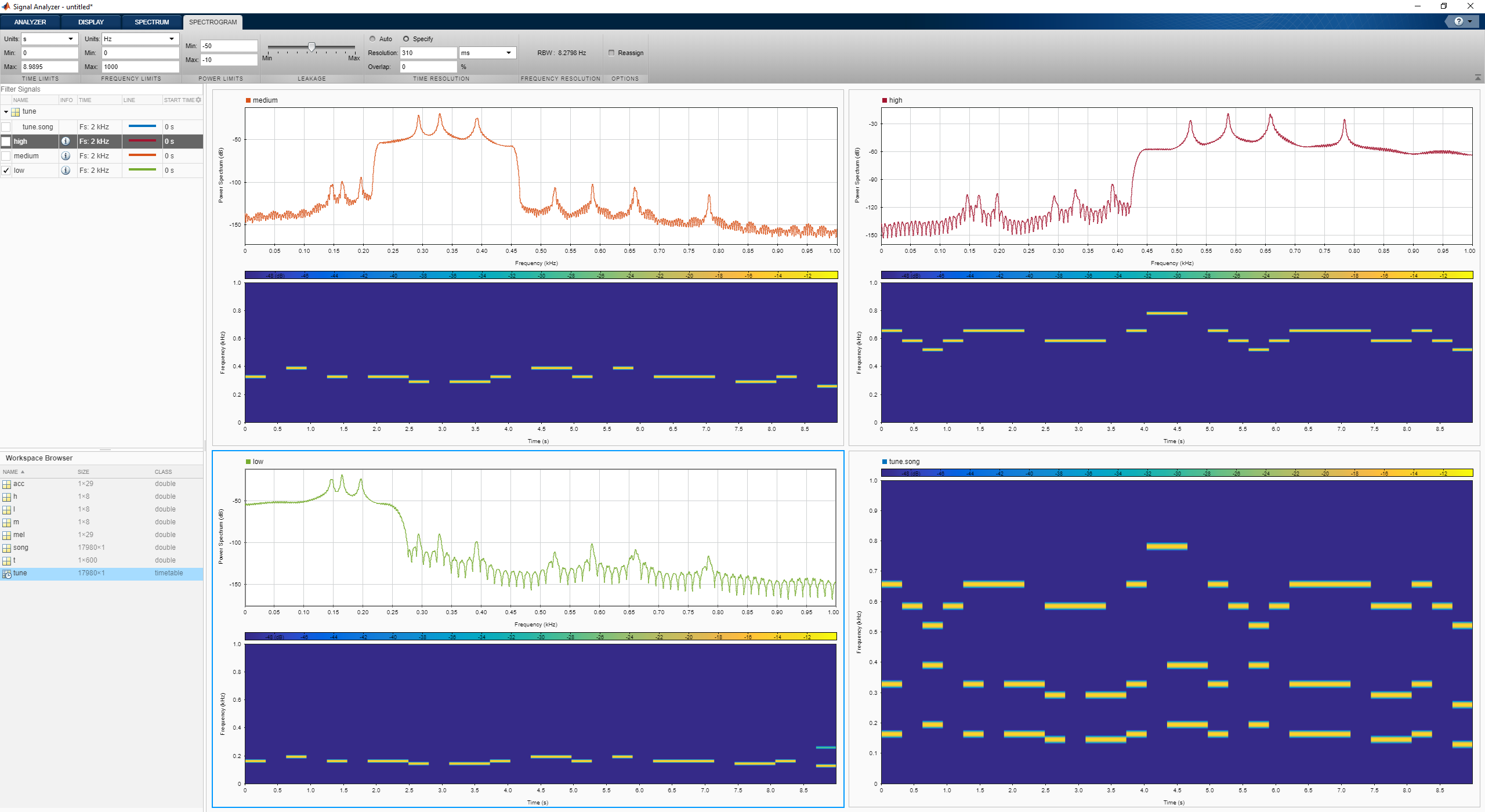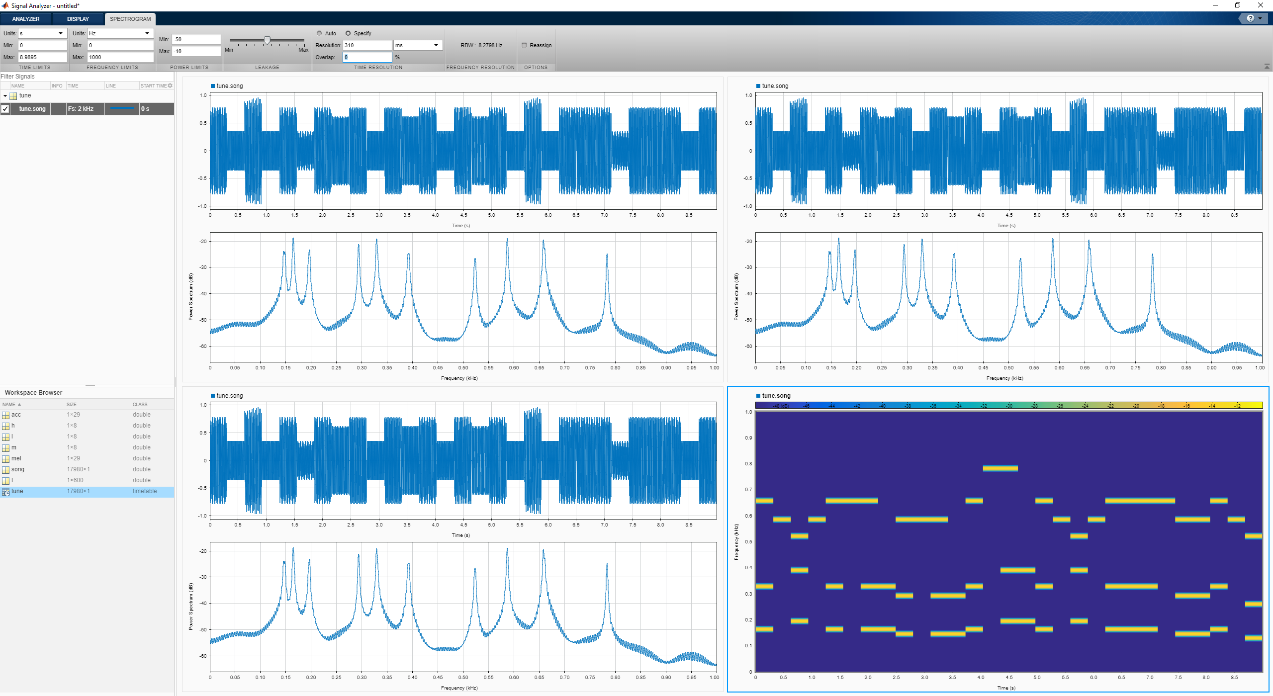 Откройте Signal Analyzer и перетащите расписание от браузера Рабочей области до таблицы Signal. Нажмите Display Grid ▼, чтобы создать two-two сетку отображений. Выберите лучшие два отображения и нижнее левое отображение и нажмите кнопку Spectrum, чтобы добавить представление спектра. Выберите нижнее правое отображение, нажмите Time-Frequency, чтобы добавить представление спектрограммы и нажать Time, чтобы удалить представление времени. Перетащите песню ко всем четырем отображениям. Выберите нижнее правое отображение, и во вкладке Spectrogram, задайте разрешение времени 0,31 вторых и 0%-х перекрытий (на 310 мс) между смежными сегментами. Установите Пределы Степени к дБ и дБ.