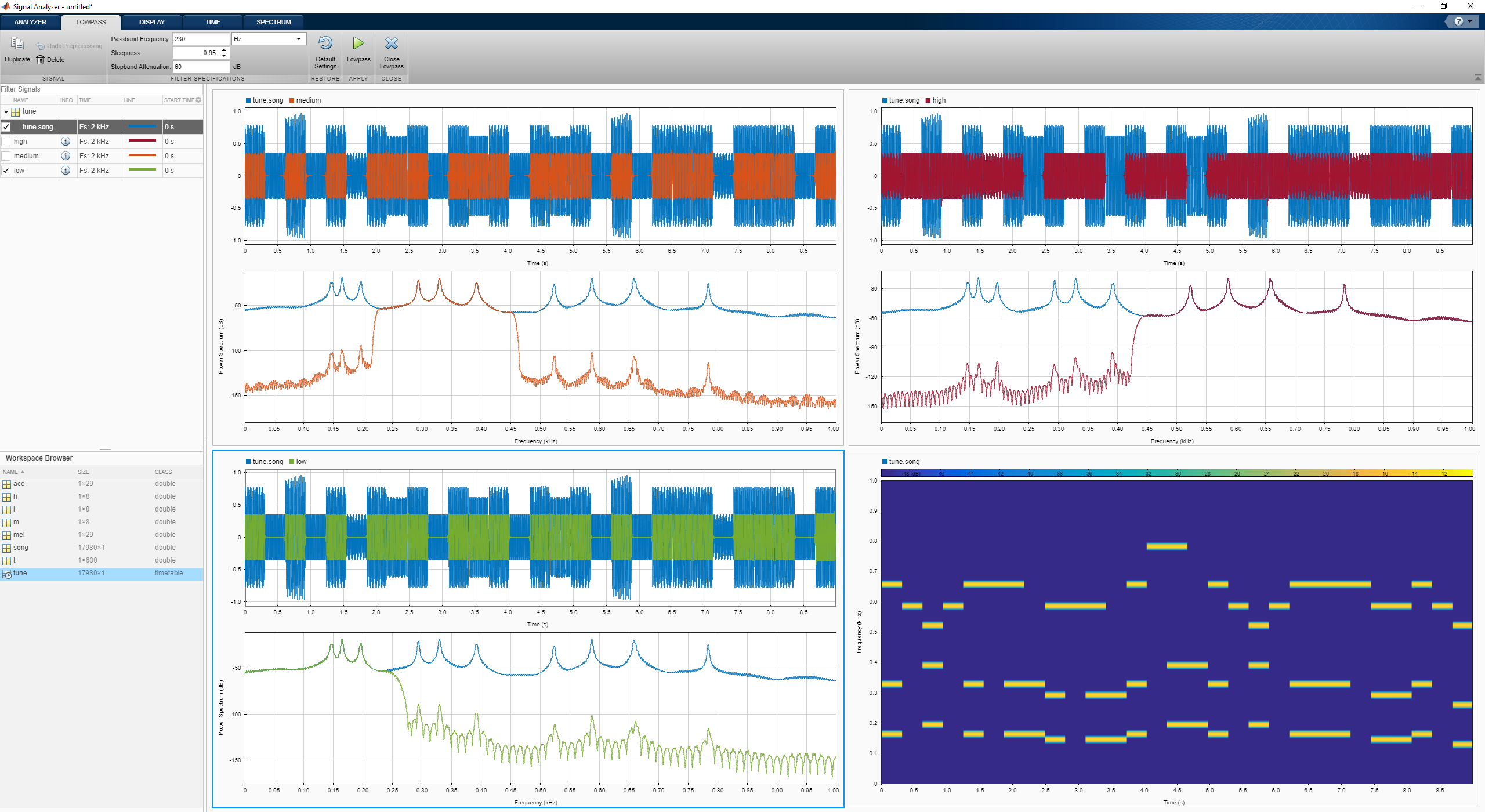 Выберите сигнал low путем нажатия на его имя в таблице Signal. На вкладке Analyzer нажмите Lowpass. На вкладке Lowpass, которая появляется, введите частоту полосы пропускания 230 Гц и увеличьте крутизну до 0,95. Нажмите Lowpass.