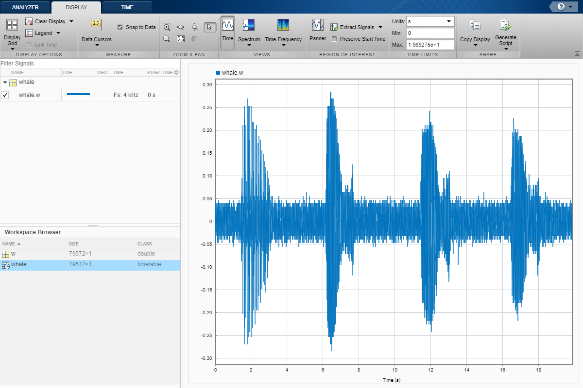 whaleFile = fullfile(matlabroot,'examples','matlab','bluewhale.au'); [w,fs] = audioread(whaleFile); whale = timetable(seconds((0:length(w)-1)'/fs),w); % To hear, type soundsc(w,fs)