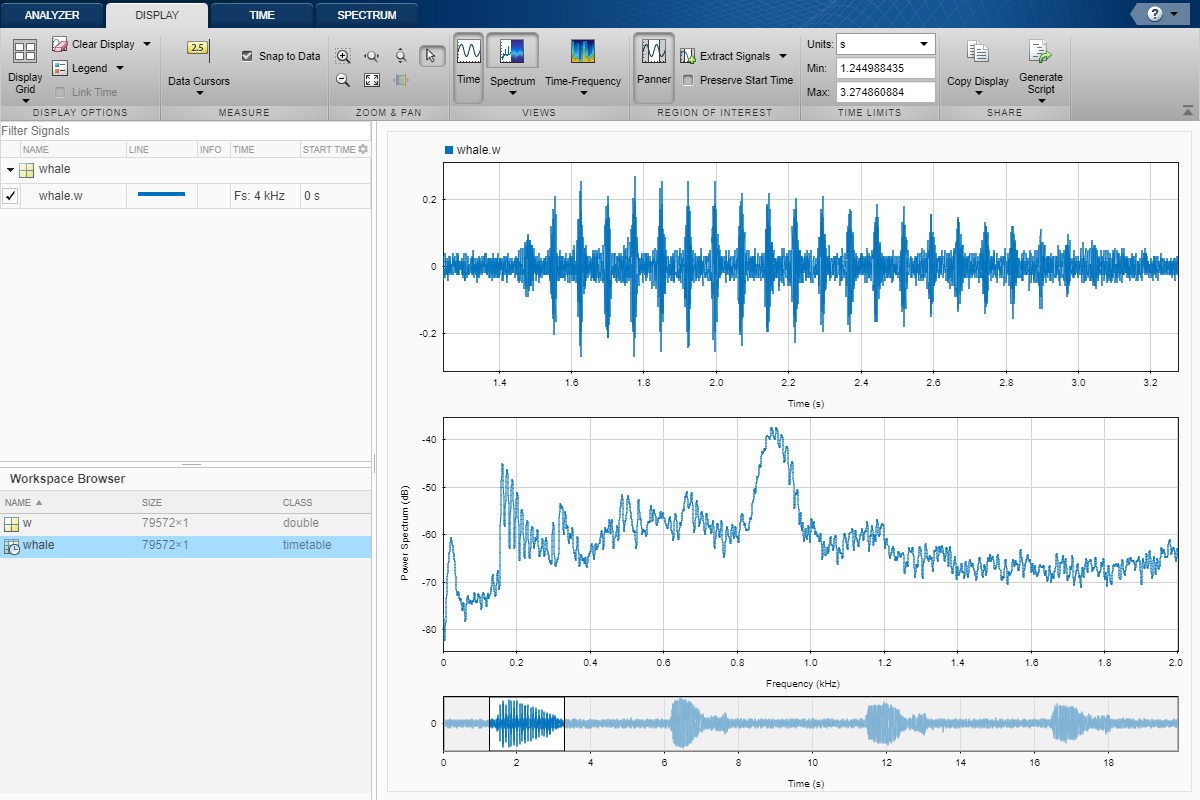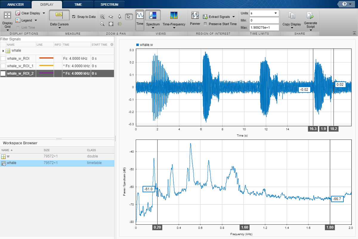 Откройте Signal Analyzer и перетащите расписание к отображению. Четыре функции выделяются от шума. Первое известно как трель, и другие три известны как стоны.