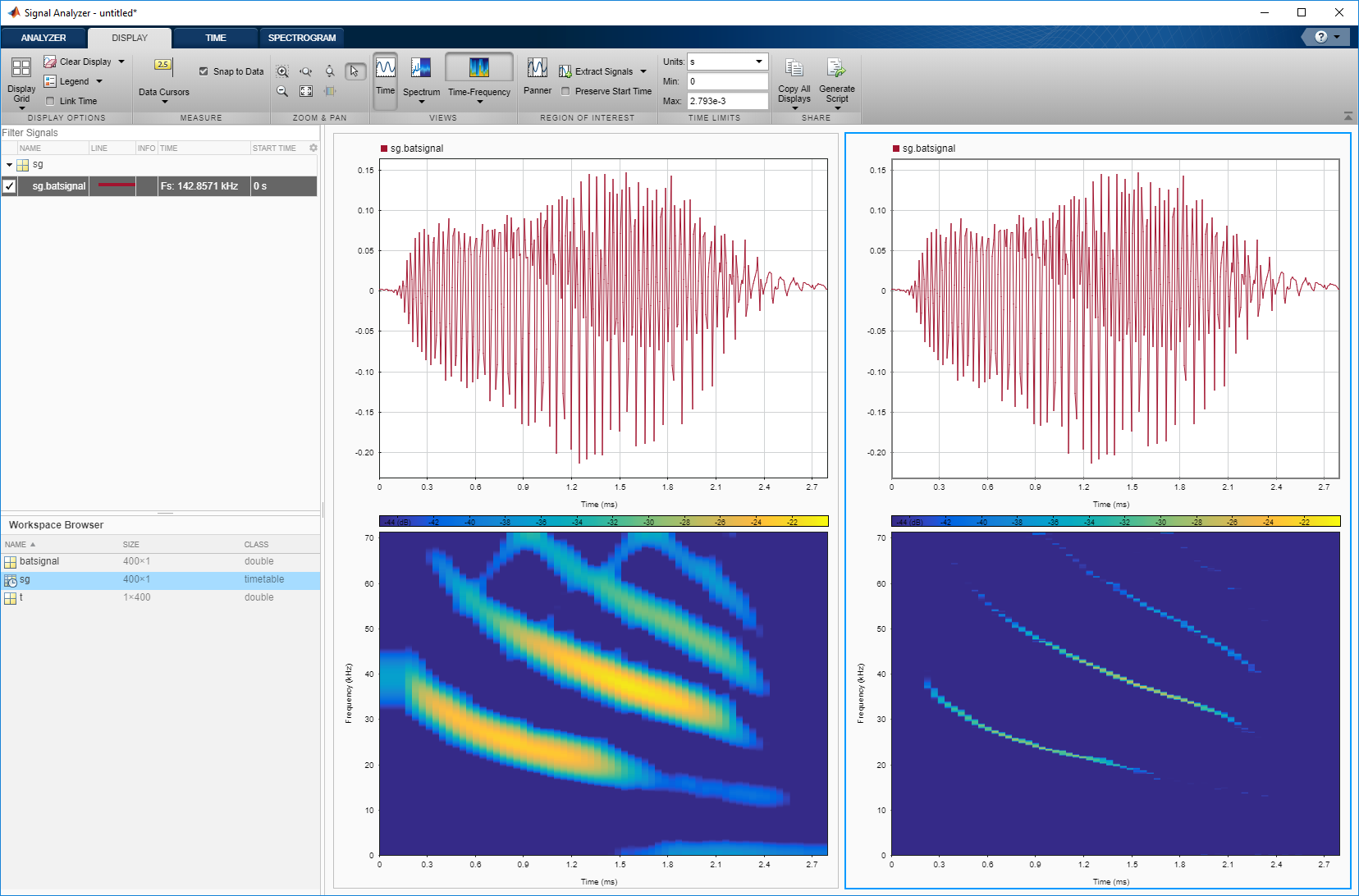 sg = timetable(seconds(t)',batsignal);Откройте Signal Analyzer и перетащите расписание от браузера Рабочей области до таблицы Signal. Нажмите Display Grid ▼, чтобы создать два бок о бок отображения. Выберите каждое отображение и нажмите кнопку Time-Frequency, чтобы добавить представление спектрограммы.