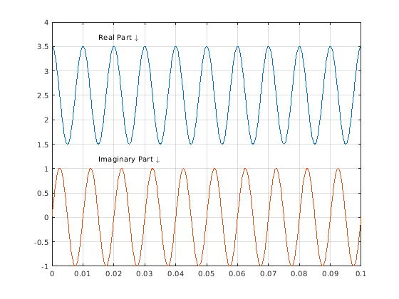 y = hilbert(x); clf plot(t,real(y)) hold on plot(t,imag(y)) xlim([0 0.1]) grid on text([0.015 0.015],[3.7 1.2], ... {'Real Part \downarrow';'Imaginary Part \downarrow'})