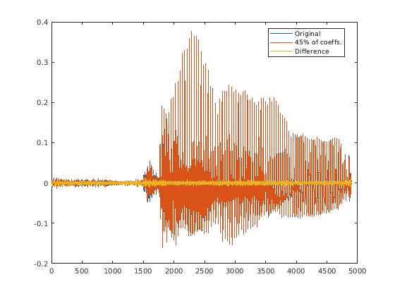 X(ind(need+1:end)) = 0; xx = idct(X); plot([x;xx;x-xx]') legend('Original',[int2str(xpc) '% of coeffs.'],'Difference', ... 'Location','best')