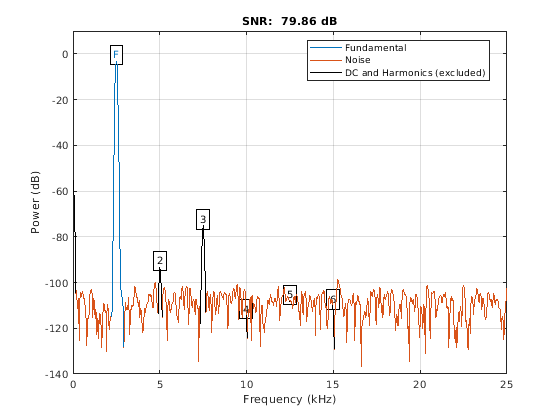 Постройте спектр сигнала и аннотируйте ОСШ, проверив, что это имеет ожидаемое значение. Функция snr вычисляет отношение степени основного принципа уровня шума и игнорирует компонент DC и гармоники.