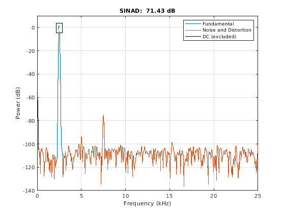 Постройте спектр сигнала и аннотируйте сигнал к шуму и отношению искажения (SINAD). Функция sinad вычисляет отношение степени основного принципа гармоник и уровня шума. Это игнорирует только компонент DC.