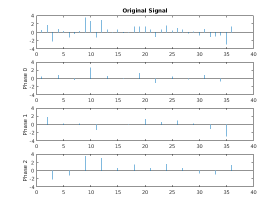 subplot(4,1,1) stem(x,'Marker','none') title('Original Signal') ylim([-4 4]) subplot(4,1,2) stem(y0,'Marker','none') ylabel('Phase 0') ylim([-4 4]) subplot(4,1,3) stem(y1,'Marker','none') ylabel('Phase 1') ylim([-4 4]) subplot(4,1,4) stem(y2,'Marker','none') ylabel('Phase 2') ylim([-4 4])