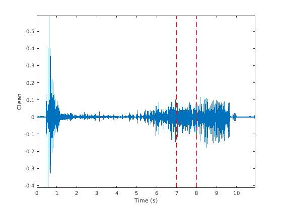 plot(Time,Full_sig,[timeA timeB;timeA timeB],[m m;M M],'r--') xlabel('Time (s)') ylabel('Clean') axis tight