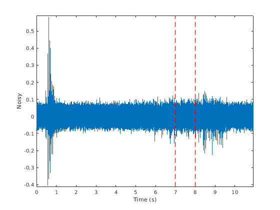NoiseAmp = 0.2*max(abs(Fragment)); Fragment = Fragment+NoiseAmp*randn(size(Fragment)); Full_sig = Full_sig+NoiseAmp*randn(size(Full_sig)); % To hear, type soundsc(Fragment,Fs) plot(Time,Full_sig,[timeA timeB;timeA timeB],[m m;M M],'r--') xlabel('Time (s)') ylabel('Noisy') axis tight