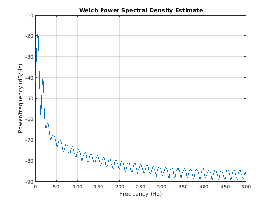 Используйте pwelch, чтобы отобразить оценку спектра мощности сигнала. Отметьте, как большая часть энергии сигнала содержится в частотах ниже 100 Гц.