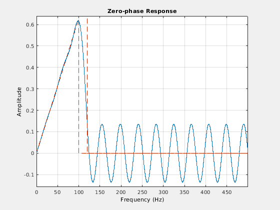 Nf = 50; Fpass = 100; Fstop = 120; d = designfilt('differentiatorfir','FilterOrder',Nf, ... 'PassbandFrequency',Fpass,'StopbandFrequency',Fstop, ... 'SampleRate',Fs); fvtool(d,'MagnitudeDisplay','zero-phase','Fs',Fs)