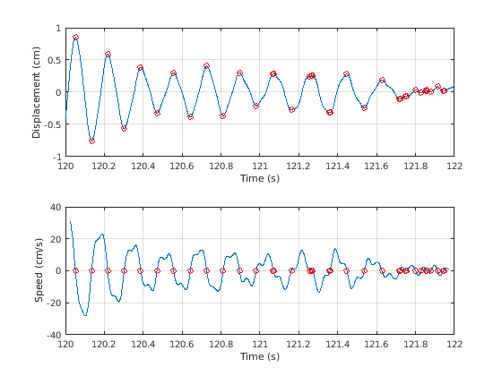 [pkp,lcp] = findpeaks(drift); zcp = zeros(size(lcp)); [pkm,lcm] = findpeaks(-drift); zcm = zeros(size(lcm)); subplot(2,1,1) plot(t,drift,t([lcp lcm]),[pkp -pkm],'or') xlabel('Time (s)') ylabel('Displacement (cm)') grid subplot(2,1,2) plot(tt,vd,t([lcp lcm]),[zcp zcm],'or') xlabel('Time (s)') ylabel('Speed (cm/s)') grid