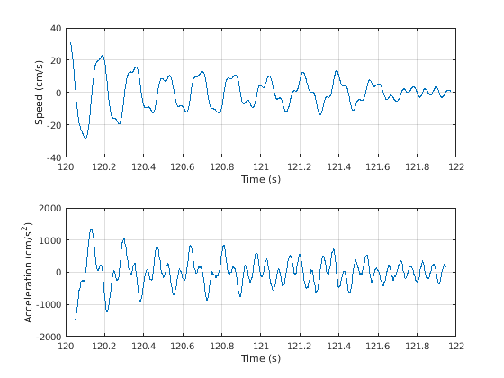 adrift = filter(d,vdrift)/dt; at = t(1:end-2*delay); ad = adrift; ad(1:2*delay) = []; at(1:2*delay) = []; ad(1:2*delay) = []; subplot(2,1,1) plot(tt,vd) xlabel('Time (s)') ylabel('Speed (cm/s)') grid subplot(2,1,2) plot(at,ad) ax = gca; ax.YLim = 2000*[-1 1]; xlabel('Time (s)') ylabel('Acceleration (cm/s^2)') grid