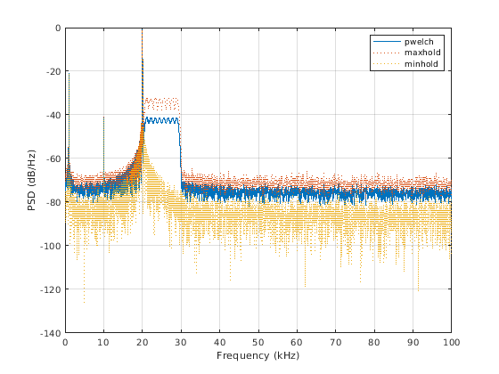 [pxx,f] = pwelch(x,[],[],[],Fs); pmax = pwelch(x,[],[],[],Fs,'maxhold'); pmin = pwelch(x,[],[],[],Fs,'minhold'); plot(f/1000,pow2db(pxx)) hold on plot(f/1000,pow2db([pmax pmin]),':') hold off xlabel('Frequency (kHz)') ylabel('PSD (dB/Hz)') legend('pwelch','maxhold','minhold') grid