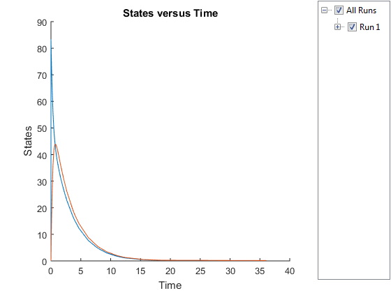 ynew — Результаты симуляцииSimDataРезультаты симуляции, возвращенные как вектор объектов SimData. Состояния, о которых сообщают в ynew, являются состояниями, которые были включены во входной параметр responseMap sbiofit, а также любых других состояний, перечисленных в свойстве StatesToLog опций во время выполнения (RuntimeOptions) модели SimBiology.