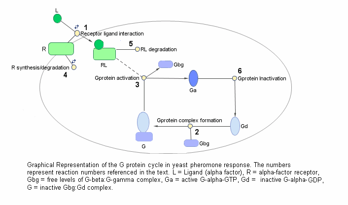 Цикл белка G в трассе ответа феромона дрожжей может быть сжат в набор биохимических реакций. Эти реакции являются комплексным формированием, преобразованием или реакциями разъединения что И и коллеги [И и др. 2003] использование, чтобы упростить и описать систему. В этом примере α-factor, α-factor приемник и подблоки белка G все обработаны как разновидности, участвующие в реакциях. Система может быть графически представлена можно следующим образом.