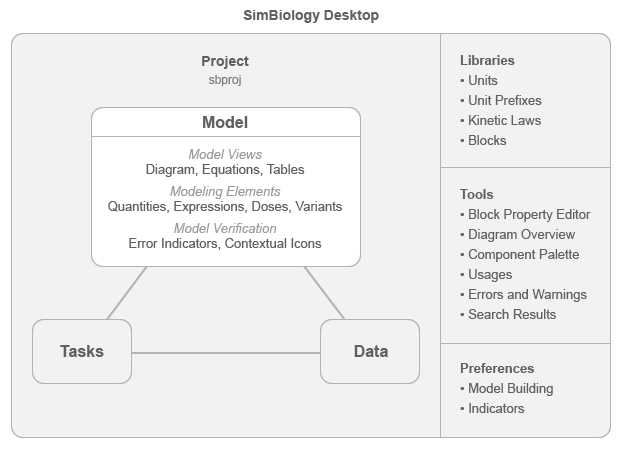 Модель SimBiology® является динамической системой, описанной набором количеств и математических выражений. Существует три типа количеств: разновидности, параметр и отсек. Три типа выражений описывают математические отношения среди количеств. Первый тип выражения является реакцией, которая описывает процесс, такой как преобразование, транспорт, связывая или развязывая реагентов и продуктов. Другой тип выражения является классом уравнений присвоения (правила), которые задают, как значения количества инициализируются или обновляются. Третий тип является событием, которое описывает изменение в значении количества во время симуляции. Для получения дополнительной информации о моделях SimBiology, смотрите то, Что Модель?.
