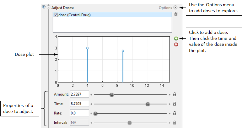 Чтобы добавить дозу, чтобы исследовать, выберите Create Dose Schedule to Explore из меню Options. График дозы показывают наряду со свойствами дозы, которые можно настроить. Чтобы добавить дозы в конкретные моменты времени и значения, сначала кликните по зеленому плюс кнопка справа от графика, и затем щелкните в графике. Можно использовать ползунки, чтобы настроить свойства дозы, такие как сумма дозы или время дозы. Чтобы удалить дозу, выберите соответствующую строку в графике. Затем кликните по красному минус кнопка справа от графика. Любая доза непроверенная не применяется к модели во время запущенной задачи.
