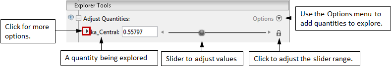 Используйте меню Options, чтобы сконфигурировать поведение ползунка и свойства. Например, чтобы мешать задаче быть запущенными каждый раз вы перемещаете ползунок, очищаете Run Task When Quantity Changes Value. Чтобы изменить область значений ползунка, выберите Define Slider Properties.
