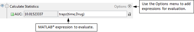 Можно выполнить математическое выражение на результатах симуляции. Выражение может быть любым допустимым выражением MATLAB, которое возвращает числовое значение. В вашем выражении можно обратиться к любому количеству его именем. Если имя количества не является допустимым именем переменной MATLAB, заключите его в квадратные скобки, такие как [DNA polymerase+]. Можно также назвать переменную времени симуляции time. Чтобы добавить выражение, выберите Define Statistics to Calculate из меню Options. Например, чтобы вычислить AUC (область под кривой) разовой концентрацией кривой препарата, используйте выражение trapz(time,Drug).
