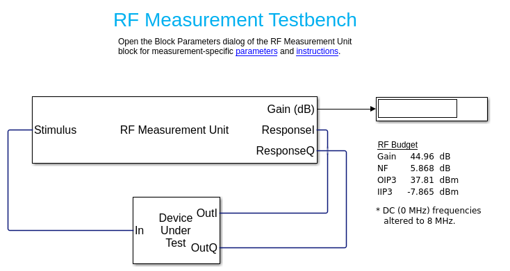 Используйте испытательный стенд Измерения РФ, чтобы проверить совокупное усиление, шумовую фигуру и нелинейность (IP3) значения системы от РФ к РФ.