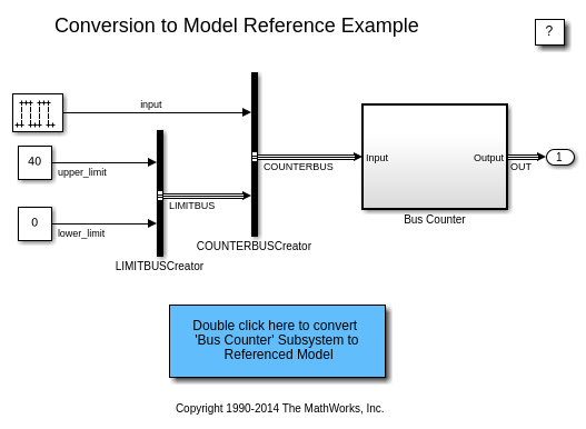 Simulink.SubSystem.convertToModelReference(... 'sldemo_mdlref_conversion/Bus Counter', ... 'sldemo_bus_counter', ... 'ReplaceSubsystem', true);