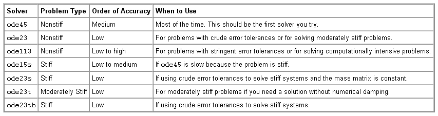 Этот пример исследует производительность ode45, ode15s, ode23 и решателей переменного шага ode23t. Читать больше о конкретном решателе, например, ode45, help ode45 типа в Окне Команды MATLAB.