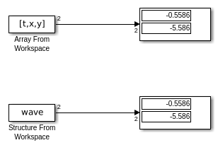 В диалоговом окне блока From Workspace используйте параметр Data, чтобы задать данные о рабочей области, чтобы загрузить. Можно задать выражение MATLAB® (например, имя переменной в рабочем пространстве MATLAB), который оценивает к одной из этих опций: