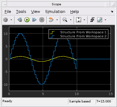 Блок From Workspace читает данные сигнала из рабочей области и выходных параметров данные как сигнал.