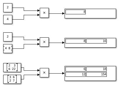 Блок продукта имеет два режима: Поэлементный режим, который процессы нескалярные входные параметры поэлементно и режим Matrix, который процессы нескалярные входные параметры как матрицы.