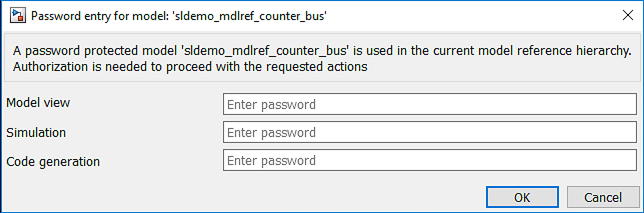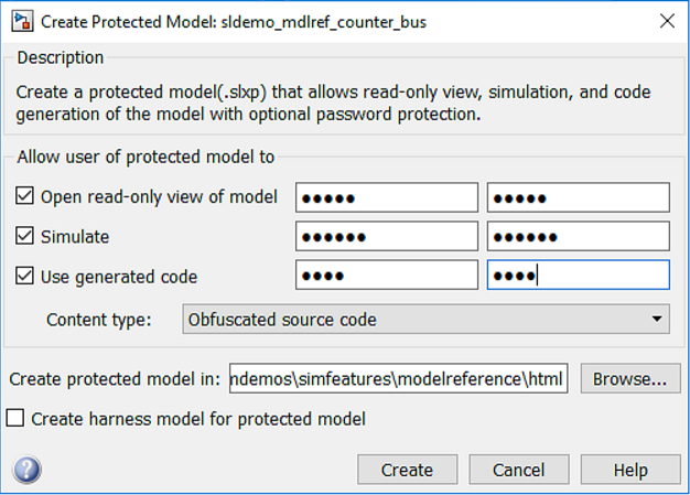 Под Позволяют пользователю защищенной модели выбирать Open представление только для чтения модели, Моделировать и Генерировать код. У вас есть опция ввода паролей для 3 вышеупомянутых функциональностей. Эти 3 пароля используются, чтобы защитить соответствующие функциональности. Введите отдельные пароли для этих 3 опций и нажмите Create. Защищенный образцовый файл, sldemo_mdlref_counter_bus.slxp, сгенерирован в текущей рабочей папке. Можно использовать эту защищенную модель в симуляциях режима Normal и Accelerated, а также для генерации кода. Можно также открыть представление только для чтения модели. Исходный образцовый файл не требуется.