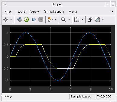 Начальная мертвая зона сосредоточена приблизительно 0 и имеет ширину 1, который расширяет .5 в каждом направлении. Вывод от блока Backlash начинается в 0 и не изменяется, пока вход не достигает ребра deadzone в .5. Затем вывод участвует в положительном направлении и изменяет равную сумму как вход. После того, как вход достигает значения 1, он начинает перемещаться в отрицательное направление. В этой точке вывод расцепляет и остается плоским, пока вход не проходит через ширину мертвой зоны 1. Если вход достигает конца зоны мертвой зоны в 0, затем вывод затрагивает и начинает перемещаться в отрицательное направление с входом.