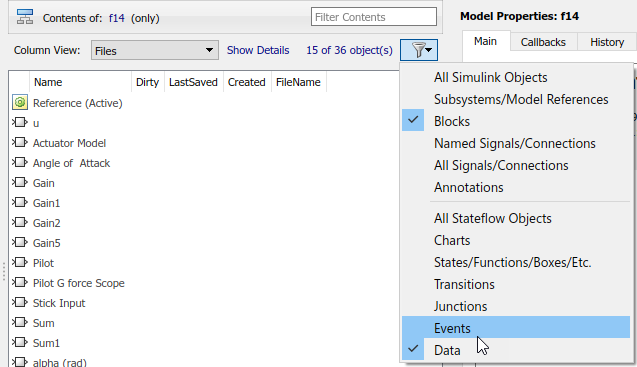 Очистите виды объектов, которые вы не хотите отображать в панели Contents или позволять любым очищенным опциям отобразить больше видов объектов. Например, очистите Events, чтобы предотвратить отображение событий Stateflow в панели Contents.