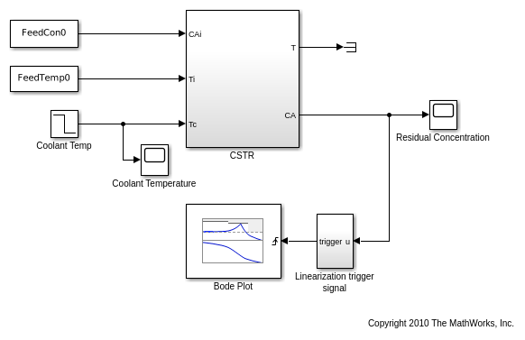 2x1 vector of Linearization IOs: -------------------------- 1. Linearization input perturbation located at the following signal: - Block: scdcstr/Coolant Temp - Port: 1 2. Linearization output measurement located at the following signal: - Block: scdcstr/CSTR - Port: 2